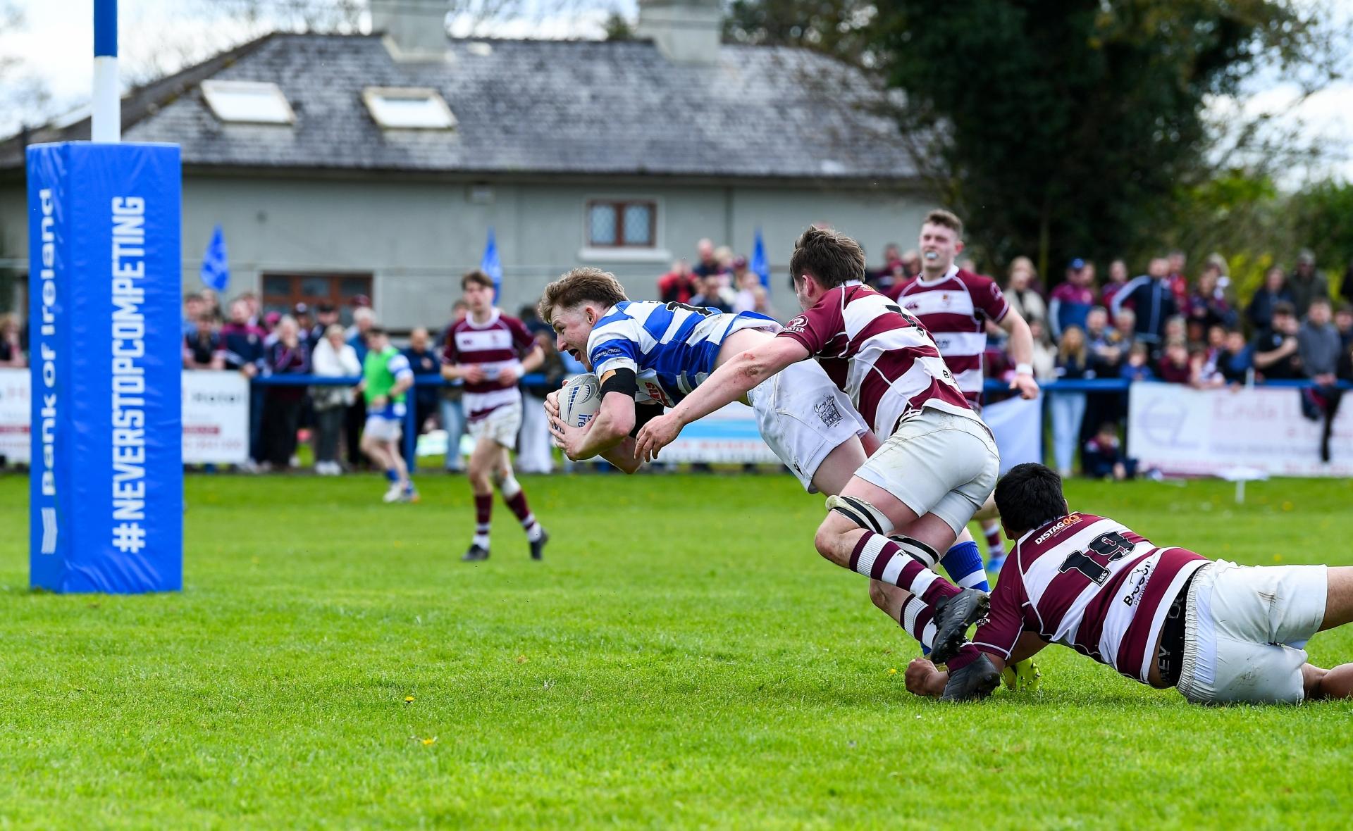 19 April 2026; Ciaran Fennessy of Athy RFC scores the second try despite the tackle of Fiach Byrne and Peter Burgess of Tullow RFC during the Bank of Ireland Provincial Towns Cup Final match between Athy RFC and Tullow RFC at Edenderry RFC in Edenderry, Offaly. Photo by Matt Browne/Sportsfile