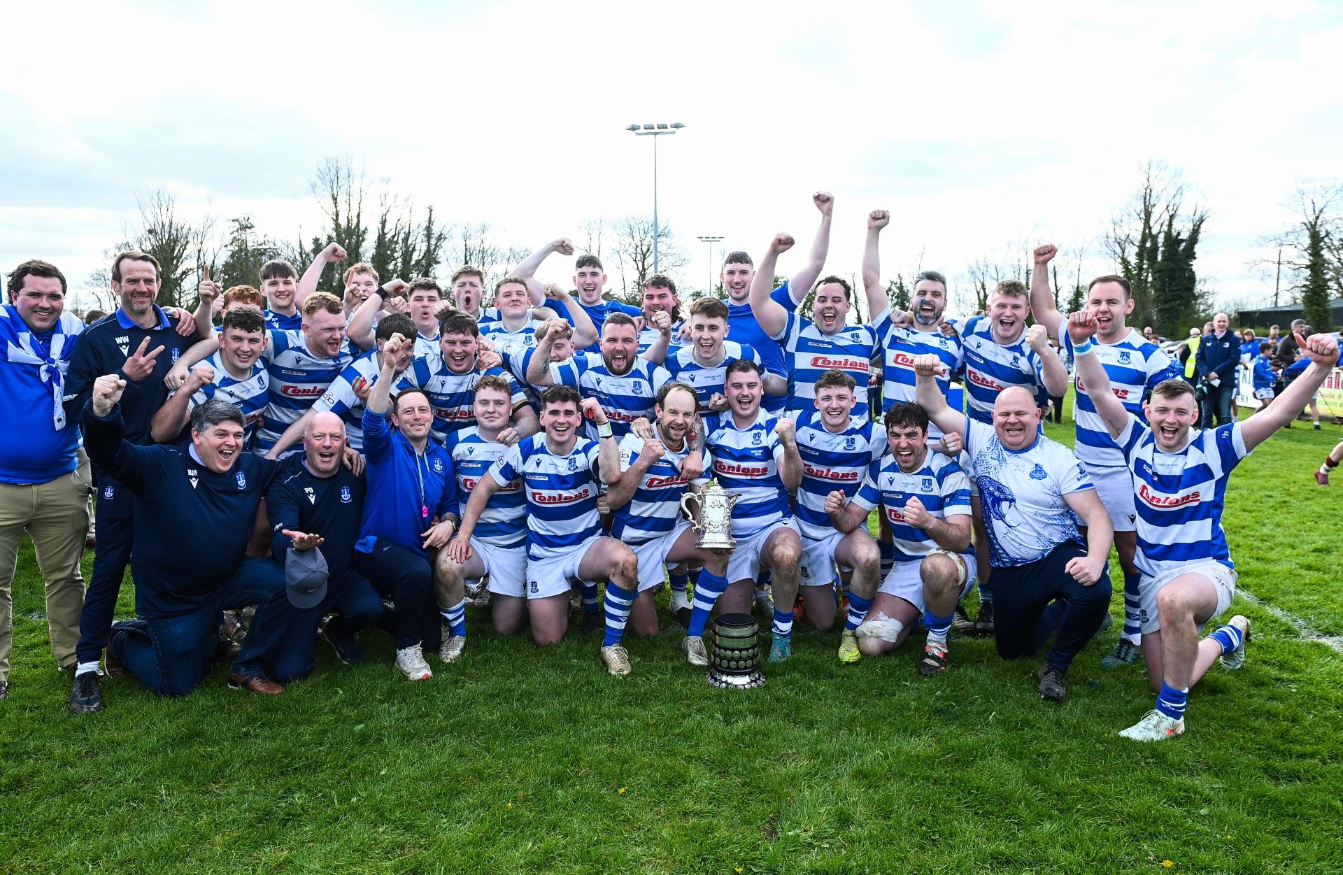 19 April 2026; Athy RFC players celebrate with the cup after the Bank of Ireland Provincial Towns Cup Final match between Athy RFC and Tullow RFC at Edenderry RFC in Edenderry, Offaly. Photo by Matt Browne/Sportsfile
