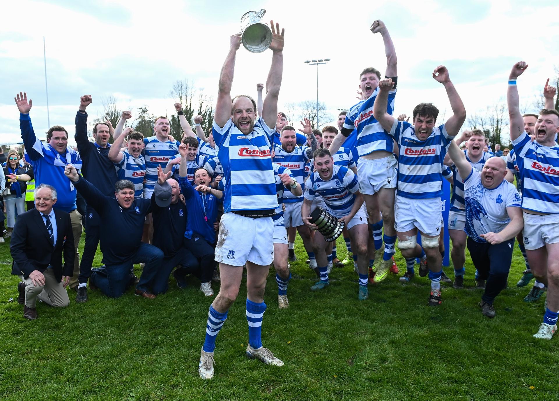 19 April 2026; Craig Miller captain of Athy RFC lifts the cup after the Bank of Ireland Provincial Towns Cup Final match between Athy RFC and Tullow RFC at Edenderry RFC in Edenderry, Offaly. Photo by Matt Browne/Sportsfile