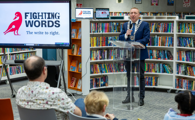Cathaoirleach Barry Walsh MCC speaking at Portlaoise Library for the launch of ‘Story Seeds: The Great Laois Mash-up’.