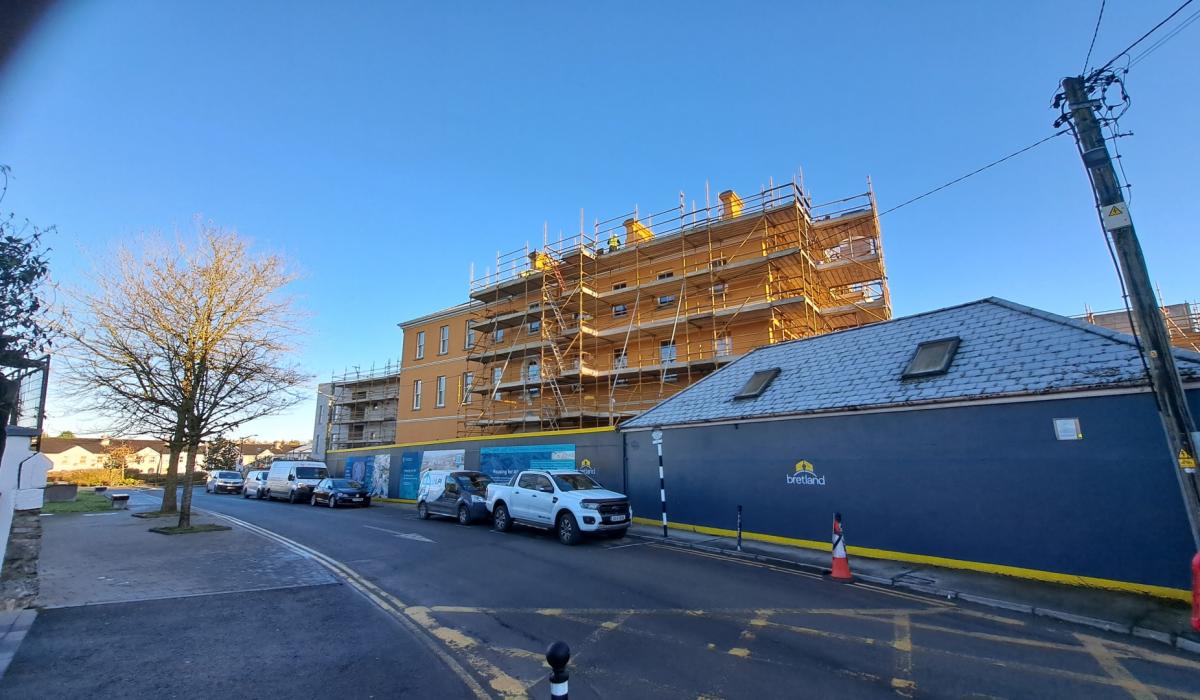 Construction workers have started to remove scaffolding from the front to the former Presentation Convent building in Portlaoise to reveal the significant progress being made at the housing development in the heart of the Laois town.